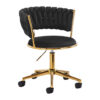 Proste wykończenie sprawia, że mebel wpada w oko. Przyjemne w dotyku, welwetowe obicie w odcieniach czerni nadaje mu wyjątkowego charakteru. Podstawa w odcieniach złota dodaje elegancji, idealnie komponując się z welwetem, a funkcjonalne koła zapewniają mobilność, ułatwiając przestawianie krzesła oraz poruszanie się po salonie w trakcie pracy. Estetyka wykonania, komfort użytkowania oraz ergonomicznie wyprofilowane oparcie sprawiają, że krzesło spełni wymagania nawet najbardziej wymagających użytkowników.