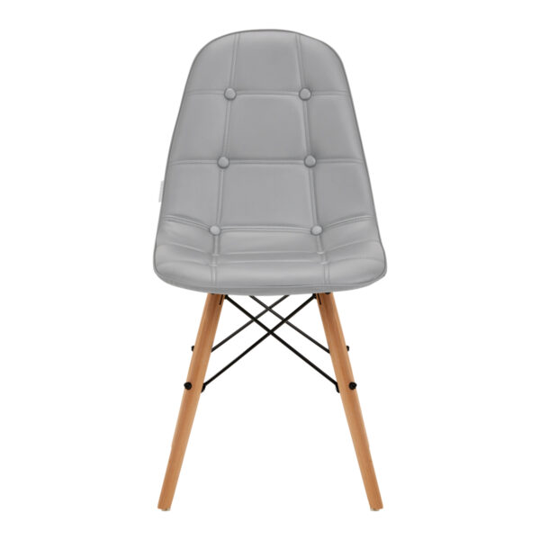 Siedzisko wypełnione jest gąbką i pokryte tapicerką z przyjemnej w dotyku skóry syntetycznej w odcieniach szarości, która jest bardzo łatwa do utrzymana w czystości. Niewielkie plamy i zabrudzenia można w prosty sposób usunąć lekko zwilżoną ściereczką. Estetyczne pikowanie oraz staranne przeszycia stanowią elegancki sznyt, a metalowy stelaż w odcieniach czerni dodaje meblowi stabilności. Matowo wykończone drewniane nóżki zakończono plastikowymi zabezpieczeniami, dodatkowo chroniącymi przed przypadkowym uszkodzeniem. Krzesło w stylu skandynawskim jest komfortowym meblem, który stanie się ozdobą recepcji każdego salonu kosmetycznego.