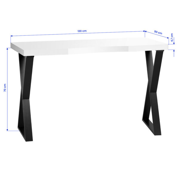 Biały blat na wysoki połysk oraz geometryczne, czarne nogi nadają mu lekkości i nowoczesnego charakteru. Dzięki swojej lekkiej formie biurko sprawdzi się zarówno w kameralnych, jak i przestronnych wnętrzach, podkreślając ich ekskluzywny charakter. To doskonała inwestycja w estetykę oraz komfort codziennej pracy.