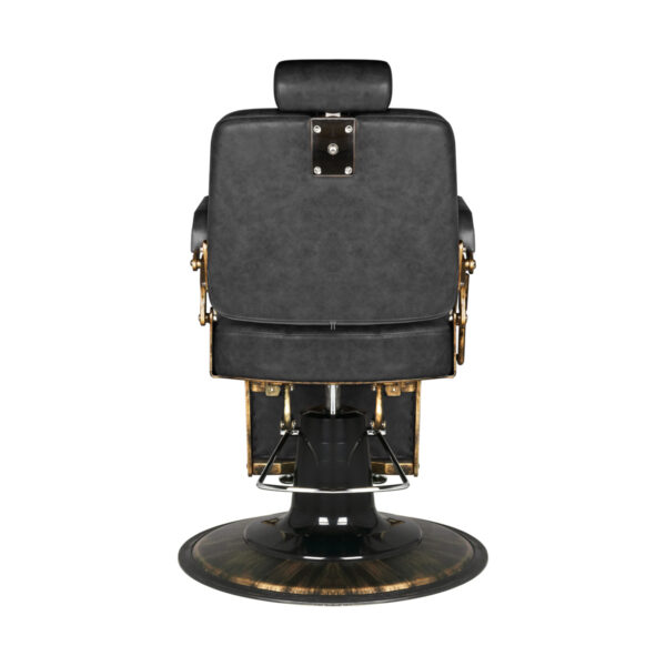 Fotel barberski w stylu retro zachwyca eleganckim designem inspirowanym klasyką motoryzacji. Solidna, okrągła podstawa zapewnia stabilność oraz komfort użytkowania. Siedzisko wypełnione trwałą, odporną na odkształcenia pianką oraz obite przyjemną w dotyku skórą syntetyczną gwarantuje wygodę i wytrzymałość na lata. Zastosowane materiały sprawiają również, że sprzęt jest odporny na wilgoć oraz łatwy do czyszczenia. Pikowana tapicerka w odcieniu czerni, wykonana z dbałością o detale, podkreśla luksusowy charakter mebla. Stylizowane metalowe podłokietniki i rama w odcieniu postarzanego złota nadają całości wyjątkowego charakteru.