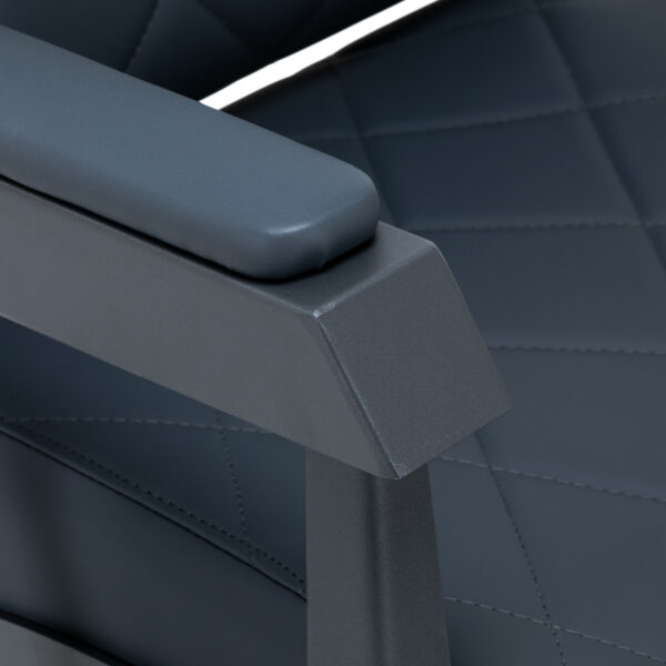 Stabilna konstrukcja zapewnia bezpieczeństwo i długą żywotność mebla. Siedzisko wypełnione pianką odporną na odkształcenia oraz obicie z miękkiej skóry syntetycznej zapewniają meblowi trwałość i wygodę. Odporne na wilgoć materiały są nie tylko wytrzymałe, ale również łatwe w czyszczeniu. Grafitowa tapicerka w połączeniu z czarną ramą nadaje fotelowi nowoczesny i profesjonalny wygląd, a minimalistyczny styl pozwala mu wpasować się w wystrój każdego salonu barberskiego.