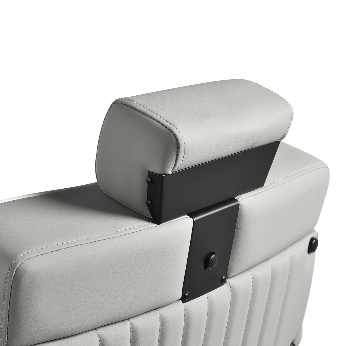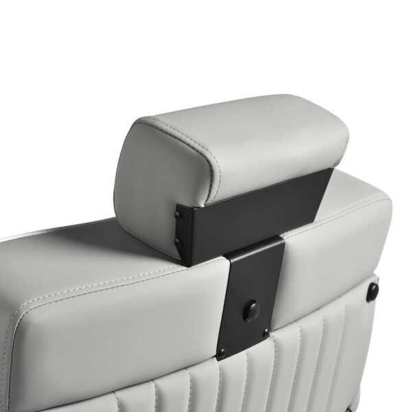 Czarna, okrągła podstawa zapewnia stabilność oraz trwałość użytkowania. Obicie z miękkiej, matowej skóry syntetycznej łączy komfort z wytrzymałością. Zastosowane materiały są odporne na wilgoć, trwałe i łatwe w czyszczeniu. Stylowe przeszycia i tapicerka w odcieniach szarości nadają mu wyjątkowego charakteru, idealnie komponującego się z wystrojem nowoczesnych salonów barberskich. Połączenie eleganckiego odcienia obicia z czarną ramą i podstawą podkreśla nowoczesny, profesjonalny wygląd fotela.