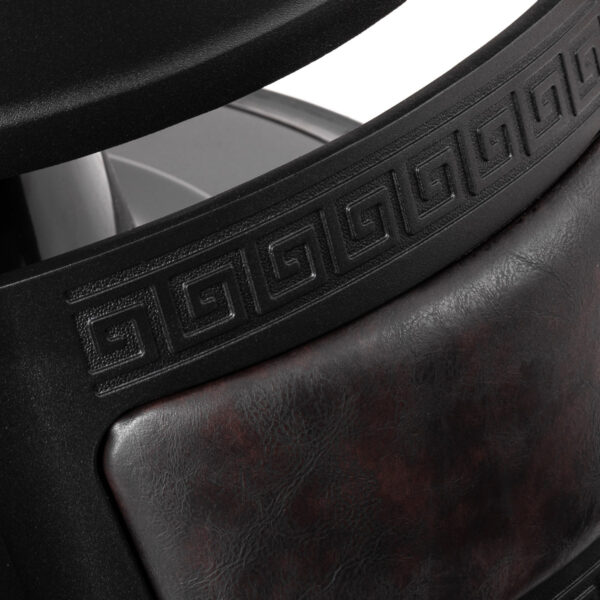 Solidna konstrukcja podstawy zapewnia stabilność oraz wysoki komfort użytkowania. Wypełnienie siedziska z trwałej, odpornej na odkształcenia pianki oraz obicie wykonane z przyjemnej w dotyku skóry syntetycznej o półmatowym wykończeniu zapewniają trwałość mebla i jego komfortowe użytkowanie przez długi czas. Sprawiają również, że sprzęt jest odporny na wilgoć, wytrzymały oraz łatwy do czyszczenia. Pokrycie w odcieniach brązu z pikowaniem i ozdobnymi guzikami nadaje mu wyjątkowego charakteru. Fotel o charakterystycznym designie, nawiązującym do stylu vintage, doskonale wpasowuje się w klimat salonów barberskich, podkreślając ich wyjątkową atmosferę.