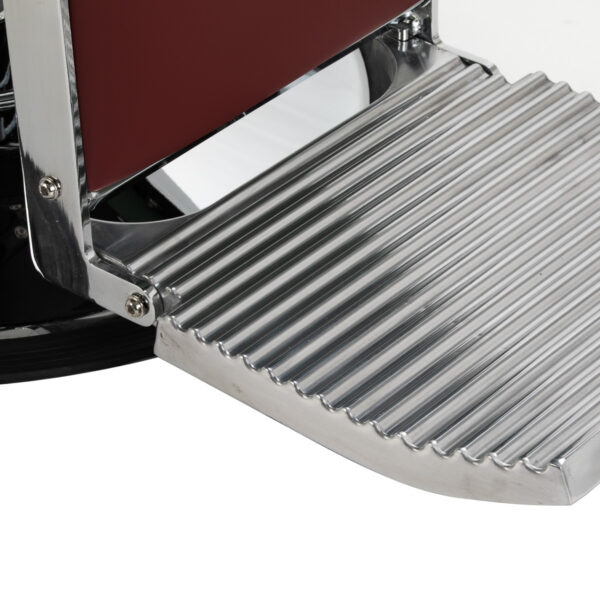 Solidna konstrukcja podstawy zapewnia stabilność oraz wysoki komfort użytkowania. Siedzisko wypełnione odporną na odkształcenia pianką oraz obite miękką, matową skórą syntetyczną łączy trwałość z komfortem. Materiały użyte do wykończenia są odporne na wilgoć, wytrzymałe i łatwe w czyszczeniu, co sprawia, że fotel doskonale sprawdza się w codziennej pracy. Stylowe przeszycia i tapicerka w odcieniach czerwieni nadają mu wyjątkowego charakteru, idealnie komponującego się z wystrojem nowoczesnych salonów barberskich.