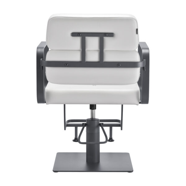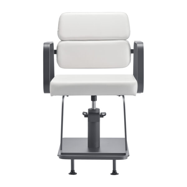 Mechanizm pełnego obrotu, w który jest wyposażony fotel, sprawia, że praca fryzjera staje się bardziej efektywna i wygodna. Solidna, płaska podstawa w kształcie kwadratu gwarantuje stabilność w trakcie użytkowania. Matowo wykończona, gładka powierzchnia nadaje elementowi elegancki wygląd i sprawia, że ten jest łatwy do utrzymania w czystości. Wygodne siedzisko z wypełnieniem z pianki zapewnia wysoki komfort użytkowania, nawet podczas wielogodzinnych zabiegów. Geometryczne, metalowe podłokietniki pozwalają na prawidłowe ułożenie barków klienta – sprawia to, że nie chowa głowy w ramionach ani się nie garbi – co wyraźnie ułatwia wykonywanie precyzyjnych zabiegów, w tym strzyżenia. Dedykowany do tego modelu stylowy podnóżek zapewnia stabilne oparcie dla stóp użytkownika.
