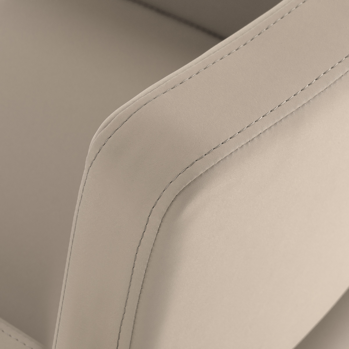 Zaokrąglone linie fotela wprowadzają lekkość i nowoczesną estetykę, a stabilna, kwadratowa podstawa w matowej czerni podkreśla stylowy wygląd. Przyjemna w dotyku skóra syntetyczna w odcieniach szarości i beżu zapewnia wygodę nawet podczas długich zabiegów, a przy tym gwarantuje trwałość, odporność na wilgoć oraz łatwość czyszczenia. Fotel pasuje zarówno do nowoczesnych, jak i klasycznych aranżacji, podkreślając profesjonalny wizerunek salonu.