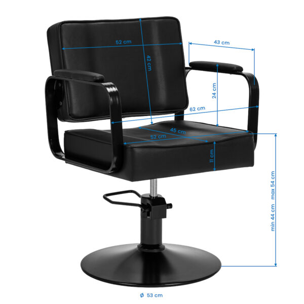 Wytrzymała konstrukcja i obicie z czarnej skóry syntetycznej zapewniają odporność na wilgoć, trwałość i solidność fotela. Okrągła podstawa w tym samym odcieniu gwarantuje stabilność i bezpieczeństwo użytkowania. Minimalistyczny design sprawia, że fotel doskonale komponuje się z różnymi stylami wnętrz salonów fryzjerskich, wprowadzając elegancki i nowoczesny akcent.