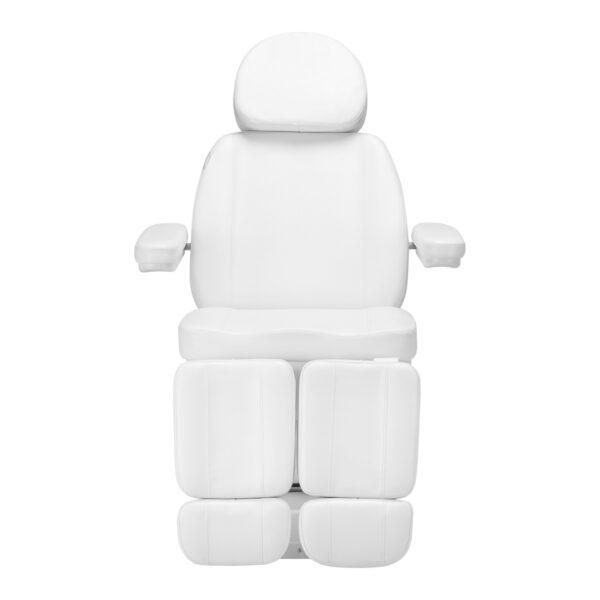 Fotel wypełniony jest wyprofilowaną pianką i pokryty przyjemną w dotyku skórą syntetyczną w odcieniach bieli. Użyty materiał sprawia, że sprzęt jest łatwy w czyszczeniu, a także odporny na wilgoć i wybrane środki dezynfekcji. Solidna podstawa wykonana z trwałego materiału w odcieniach bieli zapewnia stabilność w trakcie zabiegów. Odpowiednio wyprofilowane obszycia nadają fotelowi stylowy wygląd i sprawiają, że siedzisko jest ergonomiczne. Minimalistyczny, prosty design i klasyczna kolorystyka pozwalają mu wpasować się w każde wnętrze.