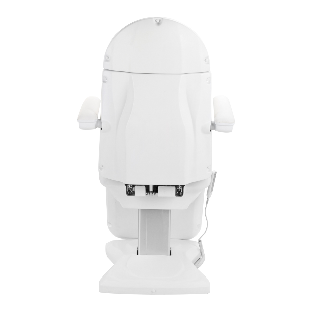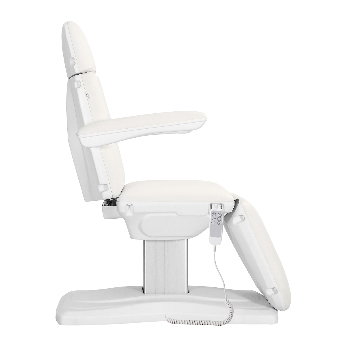 Za pomocą intuicyjnego pilota można dostosować fotel w 3 płaszczyznach – wysokości, oparcia oraz nachylenie podnóżka. Umożliwia to płynne ustawienie fotela w wygodnej pozycji leżanki, co pozwala wygodnie przeprowadzać na nim zabiegi zarówno na twarz, jak i ciało. Wysokość siedziska regulowana jest w zakresie od 60 cm do 80 cm, co umożliwia komfortowe dopasowanie pozycji do wzrostu zarówno klienta, jak i osoby wykonującej zabieg. W pełni rozłożony fotel ma długość ponad 2 metrów, co zapewnia komfort również wyższym użytkownikom. Dla większej wygody użytkowania pilot można zawiesić na uchwytach umieszczonych po obu stronach siedziska, co ułatwia jego przechowywanie i sprawia, że zawsze będzie pod ręką.