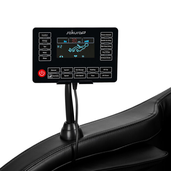 Dzięki przejrzystemu panelowi sterowania – który możemy umieścić na uchwycie zamontowanym na prawym podłokietniku bądź trzymać w dłoniach – korzystanie z fotela jest proste i przyjemne. Na wyrazistym ekranie LCD można śledzić pracę urządzenia. Wyraźnie wyświetlane są obszary ciała, na których w danym momencie przeprowadzany jest masaż, jego intensywność, czas zabiegu oraz wybrany program. Panel pozwala na swobodne dostosowywanie ustawień fotela oraz funkcji masażu, a także ustalenie czasu trwania zabiegu, który może trwać 5, 10, 15, 20, 25 lub 30 minut.