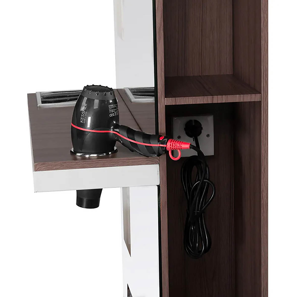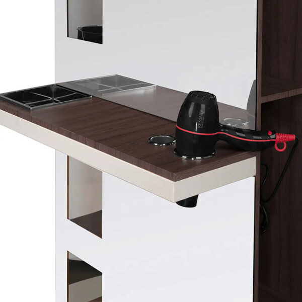 Nowoczesna konsola fryzjerska z dużym lustrem i podręcznymi półeczkami z obu stron. Zawartość półek z jednej strony są widoczne przez „okienka” Wykończenie najwyższej klasy. Elegancki i jednoczesnie uniwersalny element wnetrza, który podkresli charakter każdego salonu.