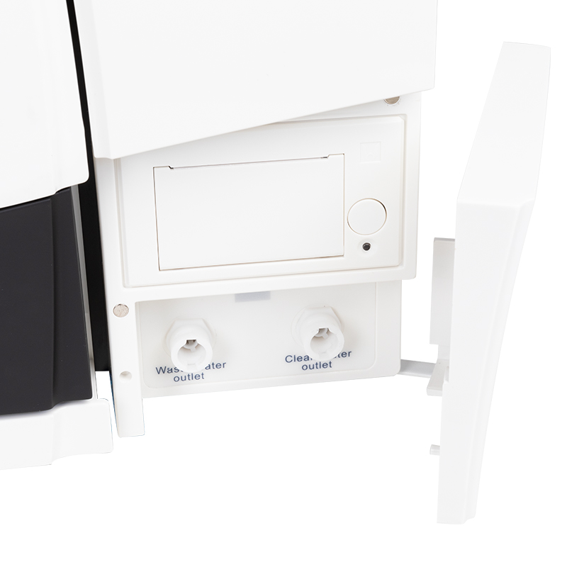 | Wbudowane zbiorniki na czystą i zużytą wodę | Zbiornik na czystą wodę jest przeznaczony na destylowaną lub dejonizowaną wodę, która posłuży do sterylizacji. Obecność zbiornika na zużytą wodę sprawia, że nie potrzebujemy pamiętać o zewnętrznym pojemniku. Odpływ znajduje się z przodu urządzenia. |