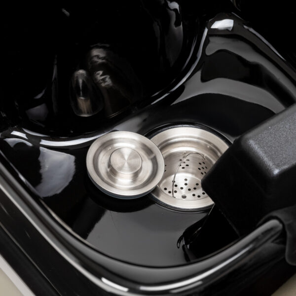 Myjnia wyposażona w baterię z mieszaczem, która umożliwia łatwy dostęp do ciepłej i zimnej wody, pozwalając na precyzyjne dopasowanie temperatury do indywidualnych preferencji klienta. Praktyczne miejsce na odłożenie słuchawki ułatwia pracę, a korek ze specjalnym sitkiem pozwala kontrolować przepływ wody i utrzymywać wysokie standardy higieny w salonie. Przyłącze wody umieszczono wewnątrz podstawy, dzięki czemu instalacja pozostaje dyskretnie ukryta, co wpływa na estetykę i porządek stanowiska pracy. Ergonomiczny kształt myjni zapewnia wygodę podczas wykonywania różnorodnych zabiegów, a przemyślane połączenie funkcjonalności i detali sprawia, że codzienna praca w salonie staje się jeszcze bardziej komfortowa.