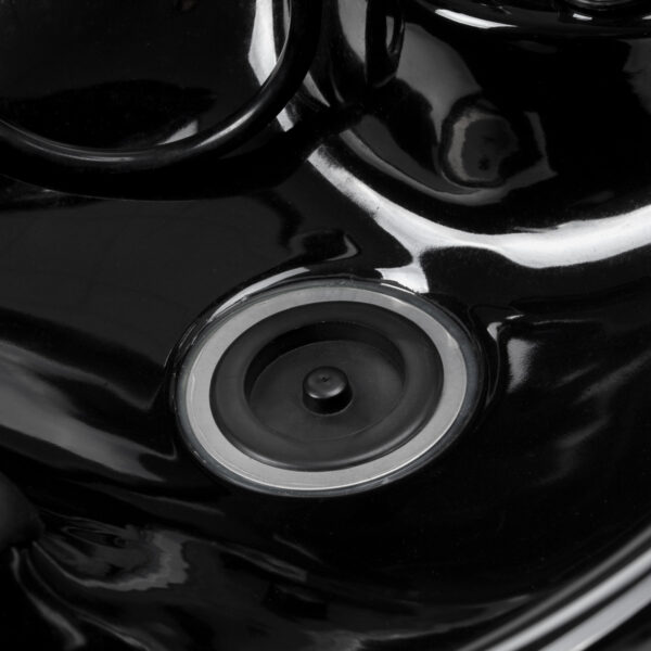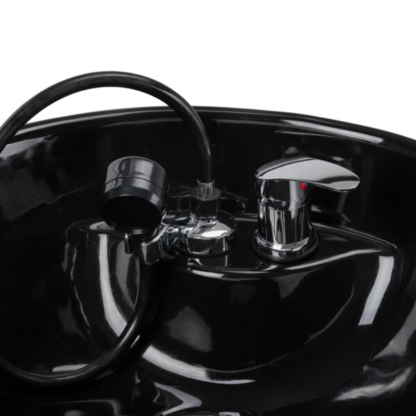 Głęboka ceramiczna misa w odcieniach czerni skutecznie ogranicza rozchlapywanie wody i kosmetyków, pomagając utrzymać porządek na stanowisku pracy. Regulowany kąt nachylenia umożliwia dopasowanie jej ustawienia do wzrostu klienta oraz preferencji fryzjera, zwiększając ergonomię wykonywanych usług. Trwała ceramika wyróżnia się odpornością na przebarwienia, zarysowania oraz działanie środków chemicznych, a gładka powierzchnia ułatwia utrzymanie wysokiego poziomu higieny. Wyprofilowany kołnierz zapewnia stabilne podparcie głowy, natomiast nakładka z tworzywa sztucznego eliminuje uczucie chłodu podczas kontaktu z misą.