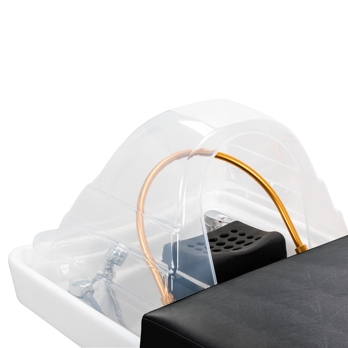 Głęboka ceramiczna misa w odcieniach bieli skutecznie ogranicza rozchlapywanie wody oraz preparatów stosowanych podczas zabiegów, zapewniając czystość i wygodę pracy. Wykonana z trwałego materiału misa jest odporna na przebarwienia, zarysowania i uszkodzenia, a jej gładka powierzchnia sprawia, że utrzymanie czystości jest wyjątkowo łatwe. Jej charakterystyczne wyprofilowanie nie tylko ułatwia dostęp osobie wykonującej usługę, ale także nadaje myjni elegancki i nowoczesny wygląd. Połączenie estetyki z funkcjonalnością podnosi standard każdej profesjonalnej przestrzeni.