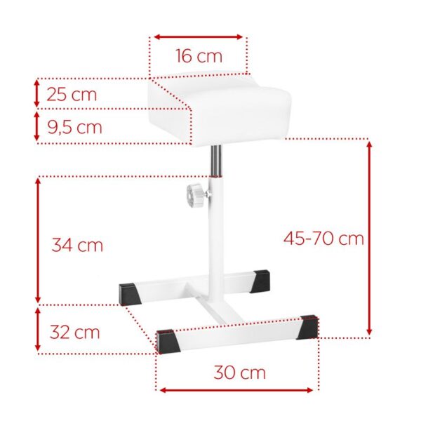 Podnóżek ma regulowaną wysokość, dzięki czemu może być pomocny podczas wykonywania wszelakich zabiegów, a w szczególności podczas przeprowadzania zabiegu pedicure.