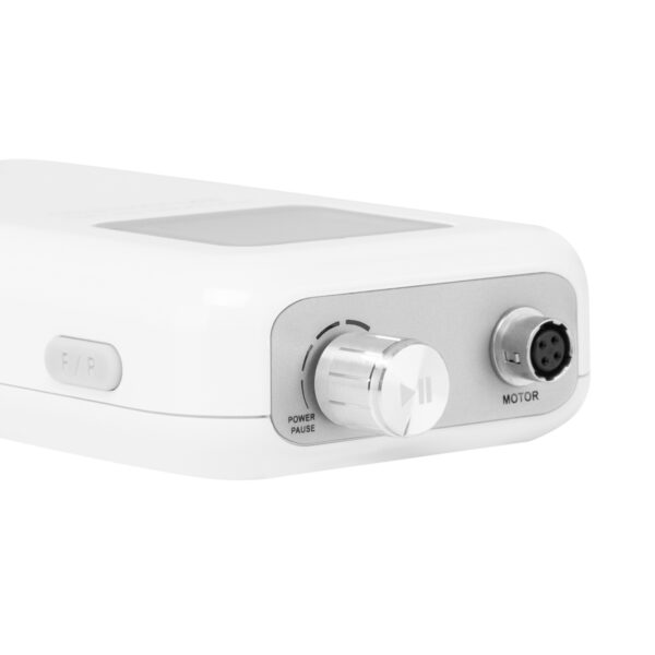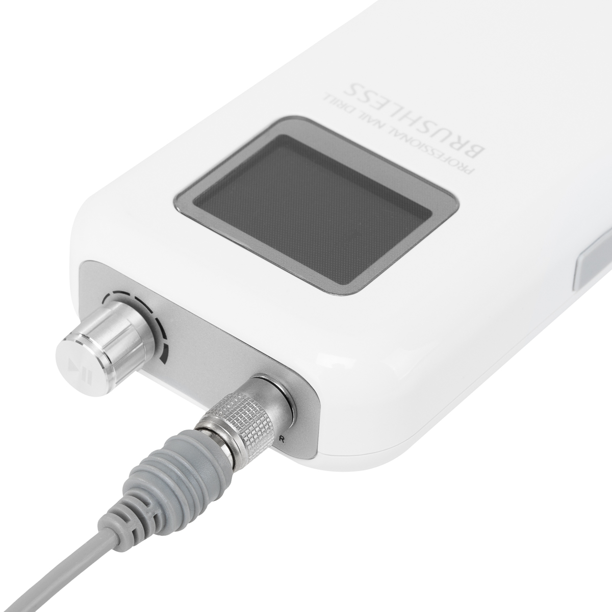 Za pomocą pokrętła można płynnie regulować prędkość pracy głowicy, osiągając aż 35 000 obrotów na minutę, co umożliwia łatwe dostosowanie do indywidualnych potrzeb i zapewnia komfort podczas wykonywania różnych zabiegów. Naciśnięcie pokrętła pozwala na natychmiastowe zatrzymanie i wznowienie pracy urządzenia (funkcja pauzy), co daje pełną kontrolę nad przebiegiem pracy. Praktyczne przyciski umieszczone po bokach umożliwiają szybkie przełączenie na napęd nożny oraz zmianę kierunku obrotów, co dodatkowo ułatwia dostosowanie urządzenia do różnych usług. Na wyświetlaczu wyświetlane są informacje o kierunku obrotów, stanie baterii, włączeniu napędu nożnego i aktywnej pauzie. Dodatkowo, urządzenie zostało wyposażone w zabezpieczenie przed przeciążeniem, które chroni silnik przed przegrzaniem, zapewniając większe bezpieczeństwo pracy i trwałość sprzętu.