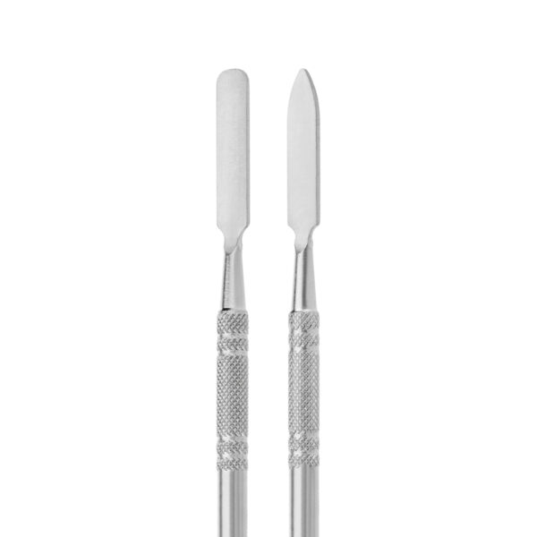 W zestawie znajduje się również dwustronna bagietka o półmatowym wykończeniu, która ułatwia mieszanie produktów. Narzędzie posiada dwie funkcjonalne końcówki o różnych kształtach, wykorzystywane w zależności od potrzeb. Przyrząd świetnie leży w dłoni, a dzięki eleganckiemu rowkowaniu na uchwycie, nie ślizga się w niej, co znacznie ułatwia pracę.
