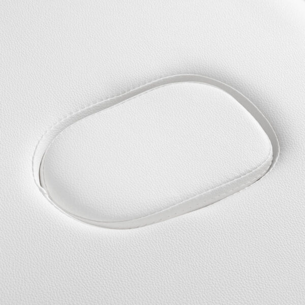 Dla zapewnienia maksymalnej wygody osoba korzystająca ze stołu może oprzeć głowę na ergonomicznym zagłówku, który znajduje się w zestawie. Element ten jest łatwy w regulacji – umożliwia dostosowanie kąta nachylenia w dwóch płaszczyznach, co pozwala precyzyjnie dopasować jego ustawienie do potrzeb użytkownika oraz charakteru wykonywanego zabiegu. W przypadku terapii prowadzonych w pozycji na plecach zagłówek można zdemontować, korzystając zamiast niego ze specjalnego otworu w blacie. Gdy nie jest używany, otwór można zakryć dołączoną zaślepką, przywracając powierzchni estetyczny i jednolity wygląd.