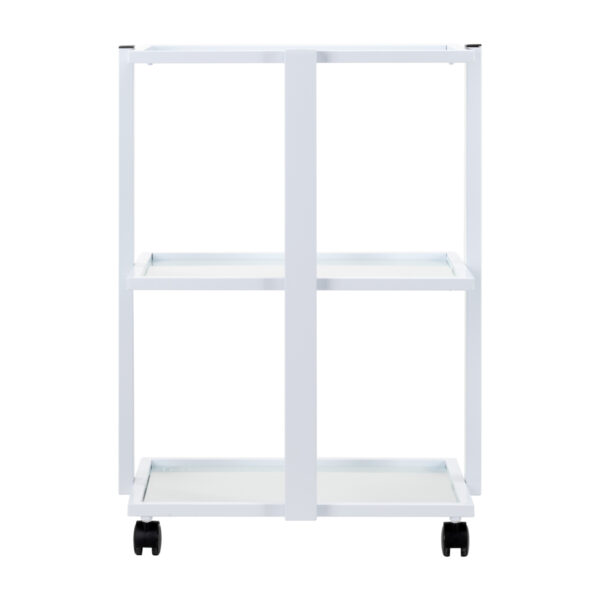 Prosta konstrukcja, stelaż z trwałego aluminium w odcieniach bieli oraz szklane półki łączą elegancję z praktycznością, zapewniając wytrzymałość i stabilność mebla. Gładkie powierzchnie ułatwiają utrzymanie stolika w czystości, a cztery kółka umożliwiają jego swobodne przestawianie, co zwiększa komfort pracy w salonie. Eleganckie wykończenie podkreśla profesjonalny charakter wnętrza. Na ramie stolika znajduje się specjalne miejsce, umożliwiające prosty montaż profesjonalnej lampy-lupy.