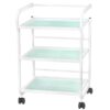 Estetyczny stolik pod urządzenie kosmetyczne, metalowo-szklany, z kółkami. Posiada cztery szklane półki z wygrawerowanym logo GIOVANNI.
