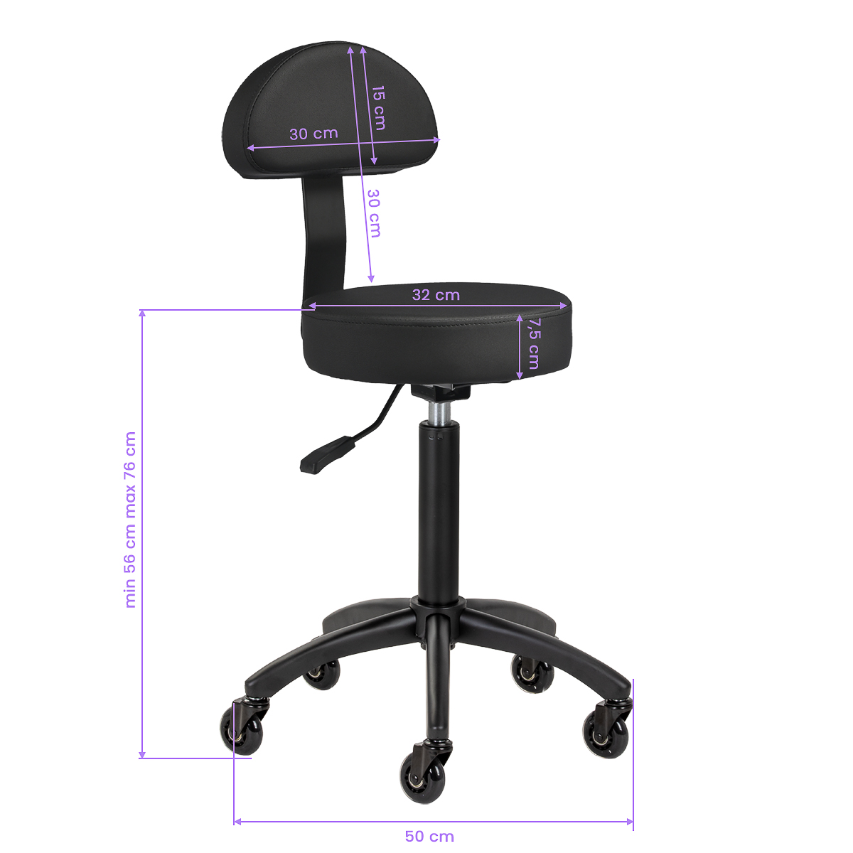 Regulacja wysokości siedziska w zakresie 56-76 cm umożliwia dopasowanie pozycji do indywidualnych potrzeb specjalisty podczas wykonywania usług. Oparcie wspiera kręgosłup, zapewniając komfort nawet w trakcie długotrwałej pracy. Mechanizm pełnego obrotu zwiększa swobodę ruchów, co przekłada się na większą wygodę i efektywność pracy. Mobilność zapewniają kółka Roll Speed z żelaznym rdzeniem i powłoką z poliuretanu (PU), które łączą płynność ruchu z wyjątkową odpornością na zużycie. Zastosowanie łożysk klasy ABEC-7 sprawia, że taboret porusza się łatwo, co znacząco ułatwia manewrowanie.