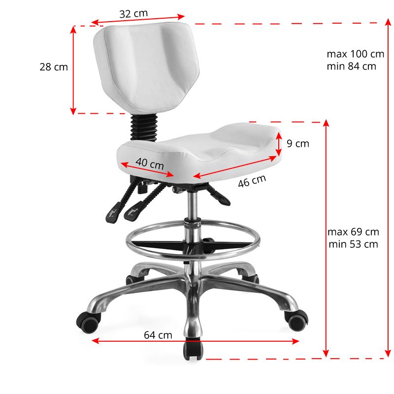 Najnowszy model taboretu kosmetycznego. Niesamowicie wygodny. Ragulacja w trzech płaszczyznach pozwala idealnie zoptymalizowac ustawienie fotela. Obok regulacji w płaszczyźnie pionowej możemy ustawić kat wychylenia oparcia oraz nachylenie siedziska. Idealny do wielkogodzinnej pracy. Nad podnożkami obręcz do podparcia nóg. Kolor obicia fotela biały.