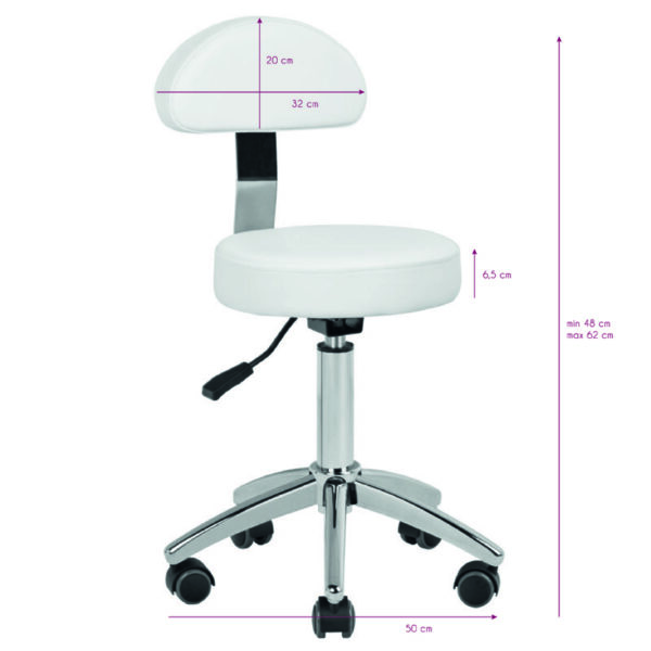 Wygodny taboret kosmetyczny, stabilny na pięcioramiennej podstawie, z gumowanymi kółkami, z możliwością demontażu oparcia, w kolorze białym, niezbędny mebel w gabinecie kosmetycznym.