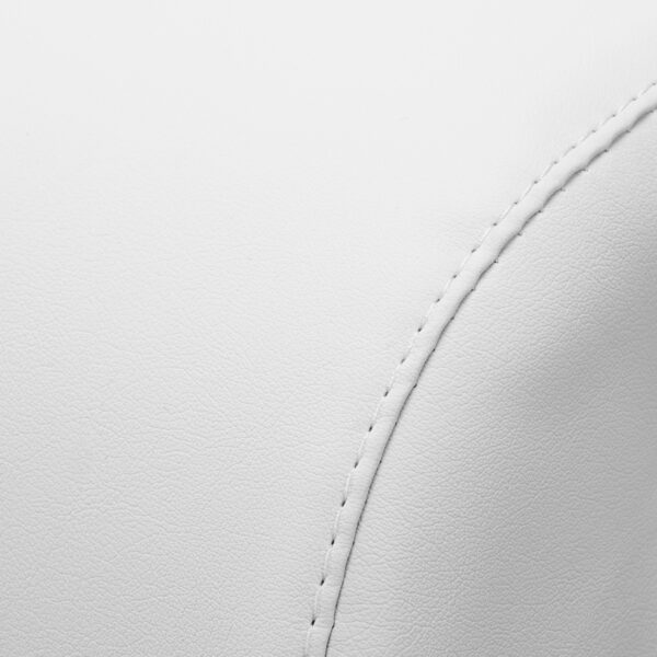 Pięcioramienna, solidna podstawa zapewnia wyjątkową stabilność taboretu, nawet podczas intensywnego użytkowania. Gumowane kółka umożliwiają jego łatwe i płynne przemieszczanie, nie niszcząc przy tym podłogi. Krzesło cechuje się trwałością i stabilnością, a jego obicie z wysokiej jakości imitacji skóry w odcieniach bieli jest odporne na wilgoć i łatwe do utrzymania w czystości, co dodatkowo podnosi komfort użytkowania.