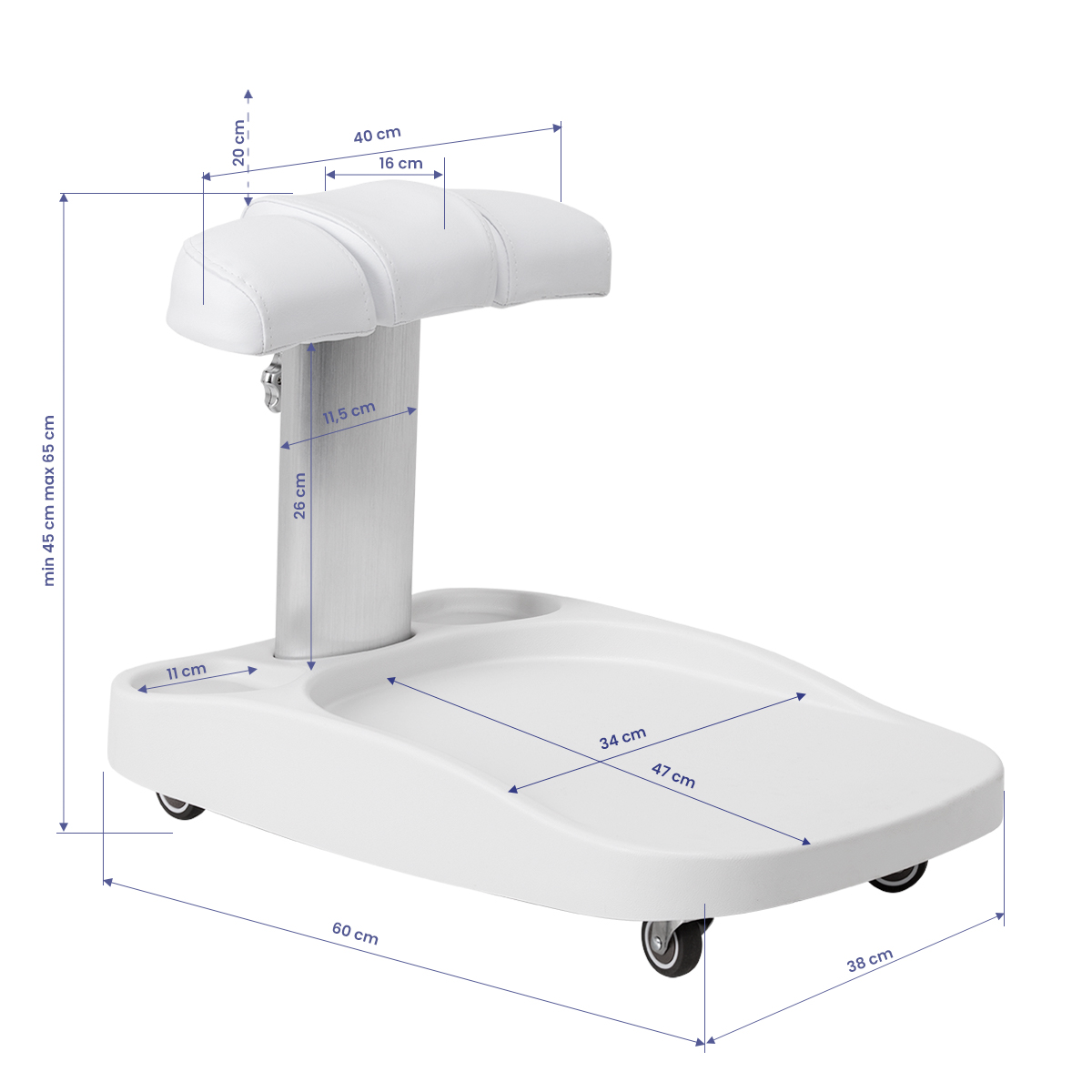 Podnóżek składa się z trzech części, z których środkowa jest wysuwana. Ręczna regulacja wysokości umożliwia podniesienie jej o maksymalnie 20 cm. Wszystkie elementy podnóżka obite są skórą syntetyczną, co zapewnia odporność na wilgoć oraz łatwość utrzymania czystości. Dzięki temu wózek można dostosować do indywidualnych potrzeb użytkownika, co sprawia, że jest doskonałym rozwiązaniem zarówno podczas zabiegów kosmetycznych, jak i podologicznych, zapewniając komfort i precyzyjność pracy w różnych pozycjach.